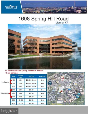 Office space of various size available from 995 square feet to 2 contiguous full floors of 15,160 sf. Walk to Spring Hill Metro, free parking.