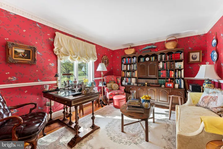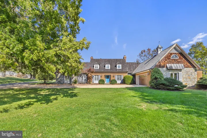 Throughout the living area of the main level, the flooring is 12” wide plank oak flooring, reclaimed from a 150-year-old barn. Immediately to the left is the library, straight ahead is the spacious living room with wood burning fireplace, which is adjacent to the formal dining room. To the right of the foyer is the family room with fireplace equipped with wood burning stove, the country kitchen, the laundry room, and the sunroom. From the kitchen one has access to the 2-car attached garage which has a finished room above, perfect for an office.