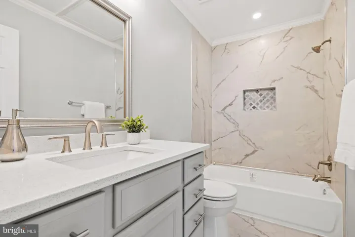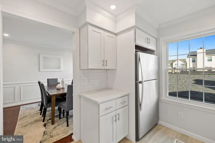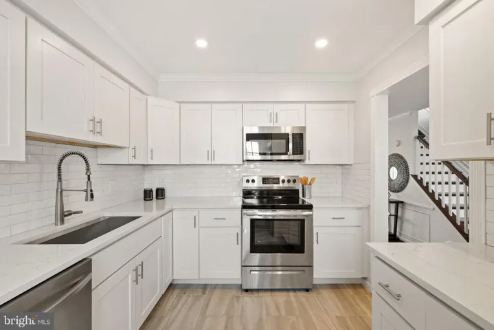 The heart of the home, the kitchen, is a culinary haven with fresh white Quaker-style cabinets, soft-close doors, luxurious quartz countertops, and stainless steel appliances. A timeless subway tile backsplash adds sophistication, while modern tile flooring balances durability with style.