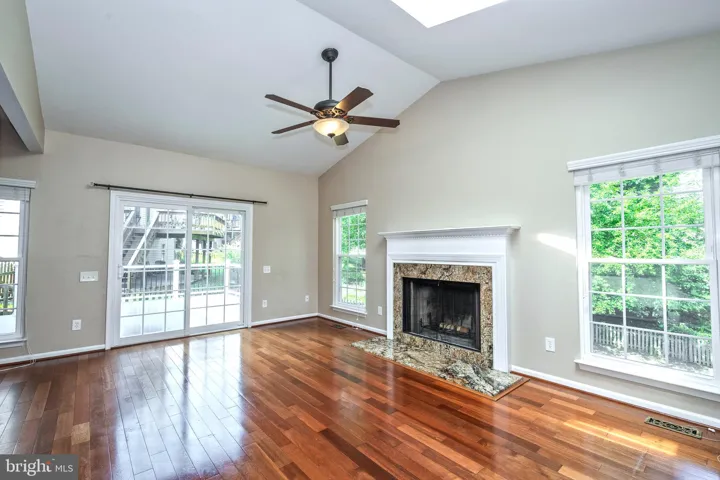 The main level features a formal living room and dining room, a kitchen overlooking the family room adorned with a wood fireplace and a cathedral ceiling with skylight.