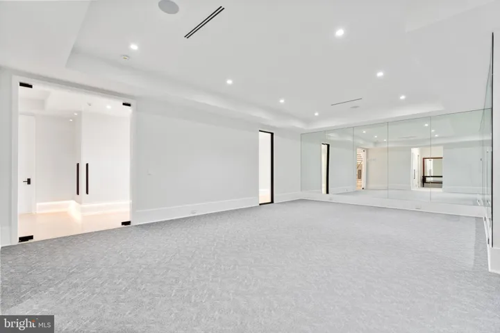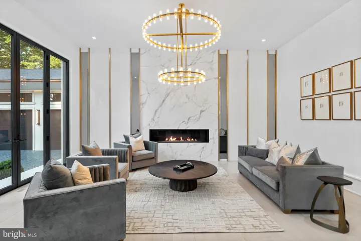 The lower garden level is an entertainer’s dream, featuring eleven-foot ceilings and a massive gathering room with a 150-inch marble fireplace and a custom crystal chandelier above the wet bar. A private tasting room and a luxurious screening room with a refreshment bar further enhance the entertainment options. The gym, complete with a private spa, dry sauna, and wet steam hammam, offers a serene retreat. A sixth bedroom and bath complete this level.