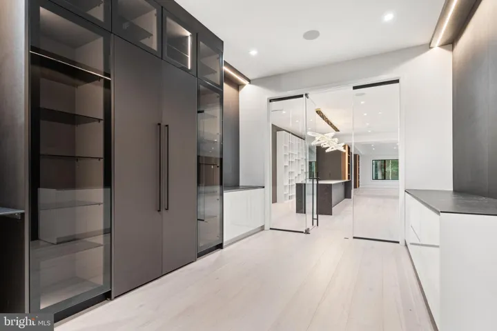 In the west wing, a richly paneled study, complete with LED-lit bookcases and a marble fireplace, provides an ideal space for work or intimate gatherings. The east wing offers a second study or receiving room, a formal powder room, and a spacious coat room. The main-level bedroom suite is a sanctuary of luxury, featuring a living room with a marble fireplace, a bedroom with soaring tray ceilings and LED lighting, and a spa inspired bath with heated floors, a dual shower, vanities, and water closets, and a soaking tub overlooking private gardens. The adjoining dressing room is a masterpiece of design, with floor-to-ceiling European cabinets and custom mirrors.