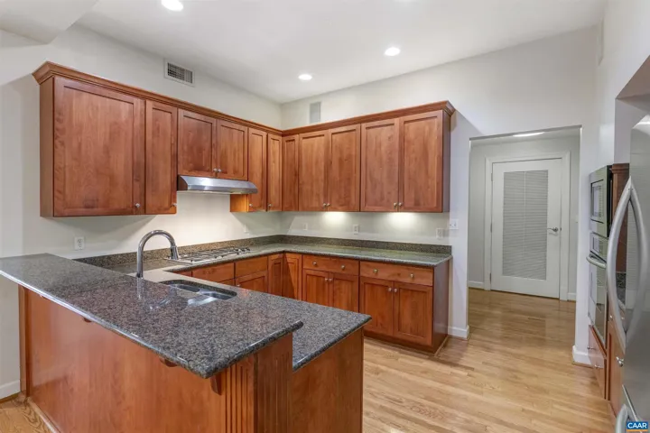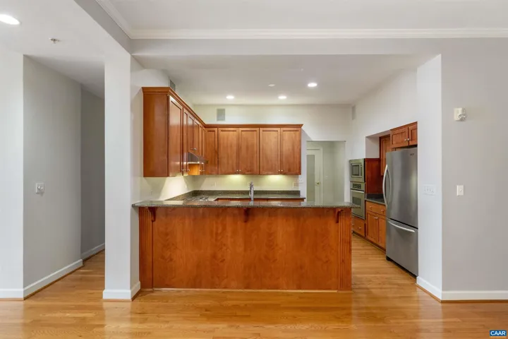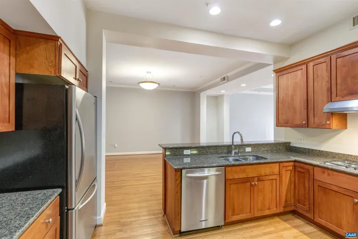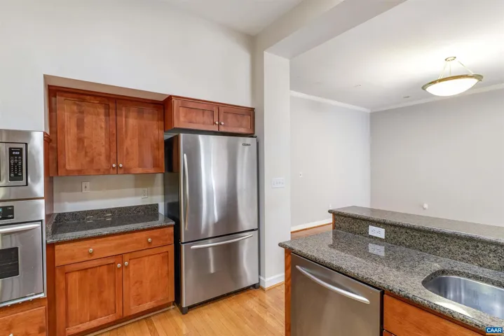 This exceptional 2 bedroom, 2.5 bath condo is ultra-conveniently located just a few steps from the bricks of the historic Downtown Mall of Charlottesville in The Holsinger building! This unit enjoys the best of Downtown living with easy access to all of downtown’s great amenities. An inviting floor plan with 1,891 finished square feet of living space featuring spacious living & dining room, fully equipped kitchen with stainless steel appliances and granite countertops, hardwood floors, huge windows with abundant natural light. Private balcony has gorgeous views of nearby Southwest Mountains. Primary bedroom has bath with dual vanities, walk-in shower and walk-in closet, and the second bedroom is en-suite. Private, secure and covered garage parking, and extra storage unit in the building. Outstanding opportunity to live on the Downtown Mall and soak in the best of city life!,Granite Counter,Wood Cabinets