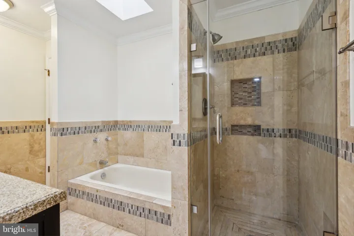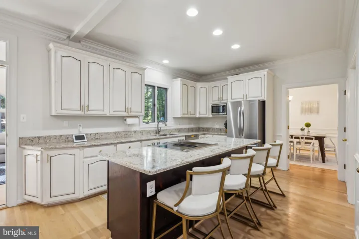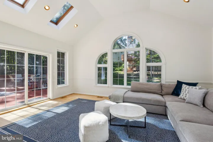 The kitchen is a true culinary haven, featuring tall white cabinetry, sleek granite countertops, stainless steel appliances, and a center island perfect for meal prep or casual dining. Silver fixtures and recessed lighting add a modern flair to this beautifully designed space. Adjacent to the kitchen, the sunroom bathes in natural light with its multiple skylights and extra-tall windows, creating a warm and inviting ambiance that’s perfect for relaxation or entertaining. For those who work from home, the main floor includes a private office with custom built-ins and shutters, providing a quiet and stylish workspace.