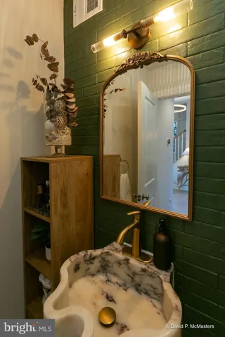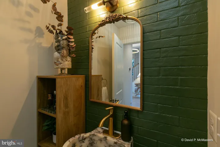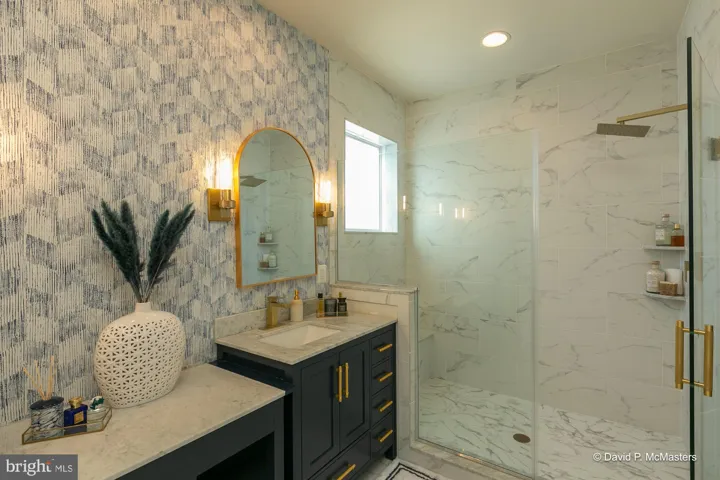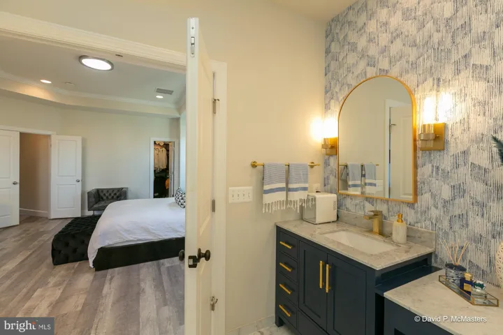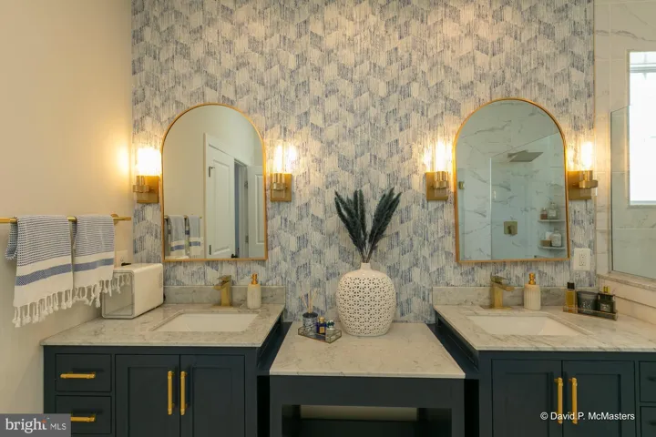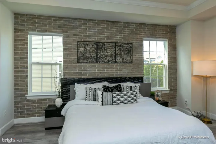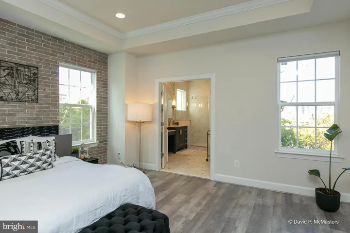 The second floor has a large luxurious primary bedroom suite with modern touches, featuring a stunning accent brick wall and tray ceilings that create a sense of spaciousness and elegance. The attached spa-like en-suite bathroom is a true retreat, complete with dual vanities, granite countertops, and gold fixtures that add a touch of sophistication. The large walk-in shower with custom tile work and premium finishes provides a relaxing space to unwind.