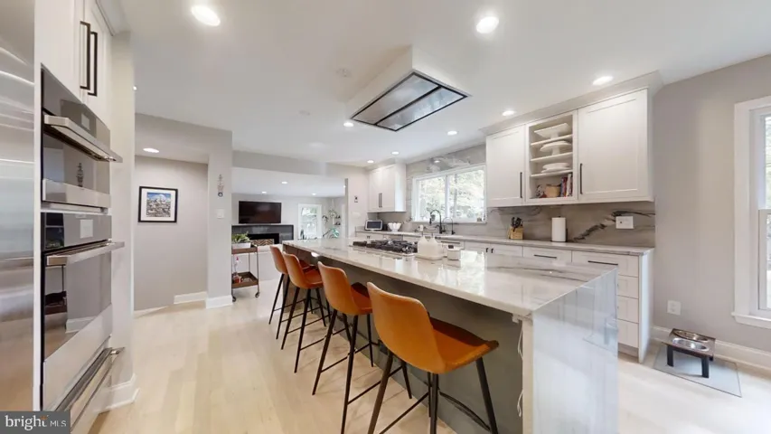 In 2022, the home underwent a major renovation, bringing a host of modern upgrades and impeccable finishes. The main level boasts a brand new, chefs’ kitchen, complete with custom cabinets, a large island, Jennair upgraded appliances, a vented hood, a water filtration system, and a new coffee bar with an additional sink. Sleek new countertops and updated hardwood floors create an inviting atmosphere. The family room features a gas fireplace with a resurfaced marble and tile surround, adding a cozy yet sophisticated touch to the living space.