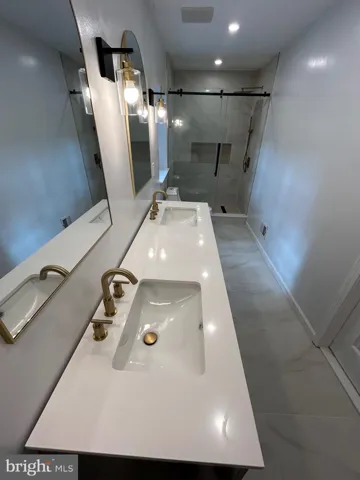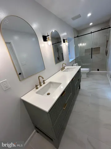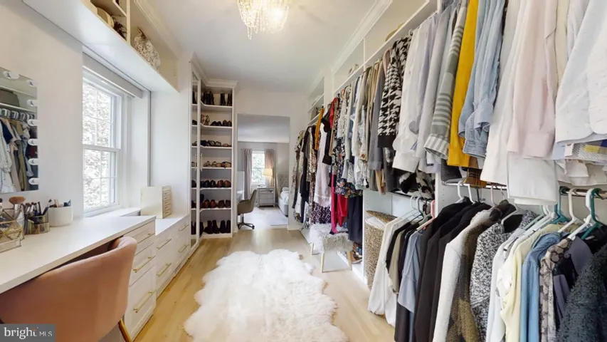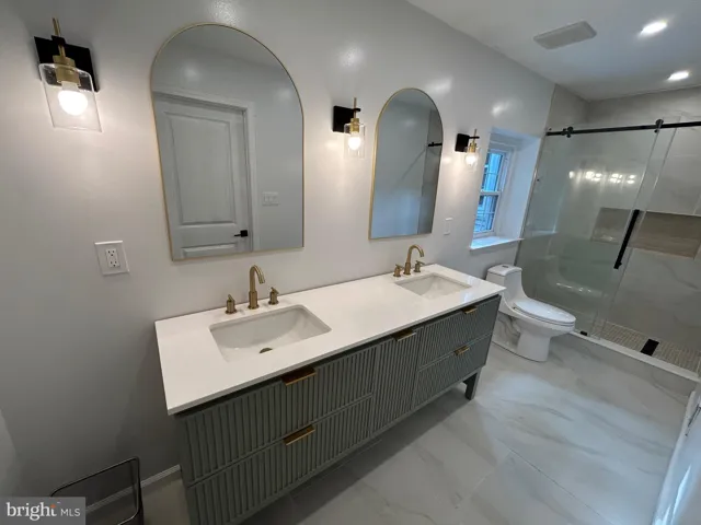 Upstairs has a large master bedroom, 3 additional bedrooms, and 2 full baths. The fifth bedroom has been transformed into an expansive walk-in closet, featuring hardwood floors, custom cabinetry, custom closet, mirrors, and updated lighting. The master bathroom and hallway bathroom both feature new tile flooring, double vanities, and glass shower/tub doors. Throughout the upper level, new lighting fixtures continue the modern aesthetic.