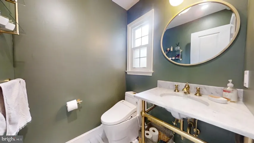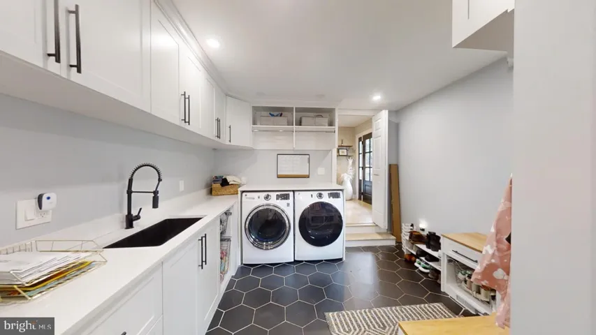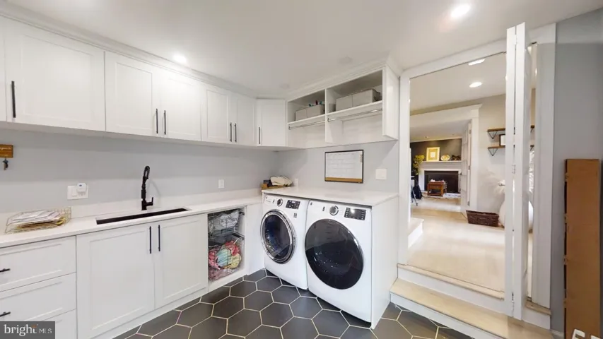 Other main floor updates include a completely remodeled powder room with a marble sink, Kensington toilet, and bidet. A spacious home office/library featuring custom bookshelves and new lighting. The laundry room is equipped with new custom cabinets, countertops, a new sink and faucet, GE washer/dryer, and a new window to brighten the space.