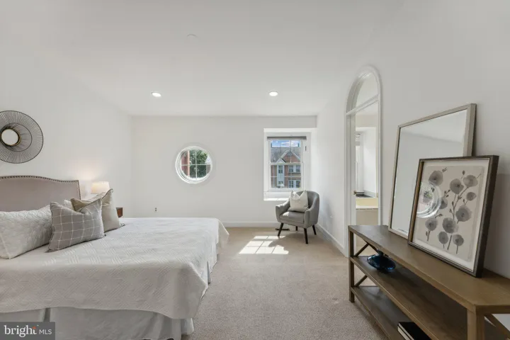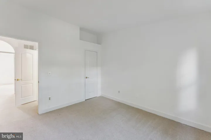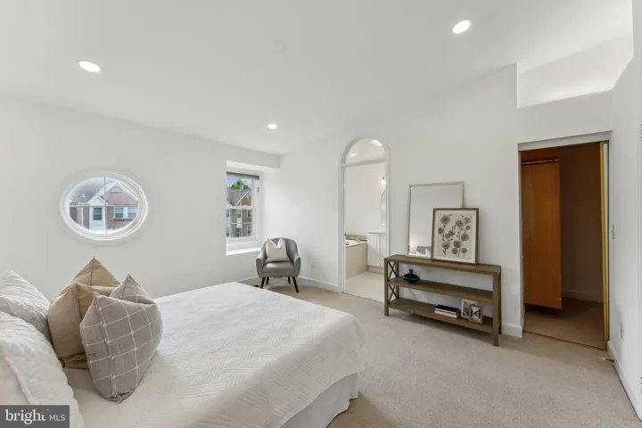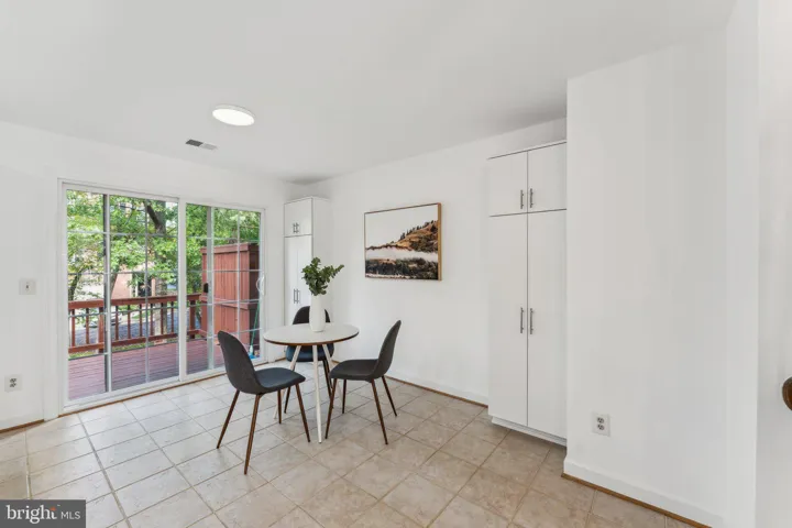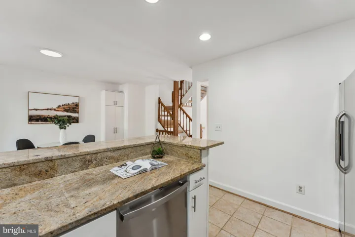 The kitchen is a highlight, featuring an L-shaped peninsula with granite countertops, crisp white cabinetry, stainless steel appliances, and recessed lighting. With an eat-in kitchen space and French doors leading to your private second-story deck, it’s perfect for both everyday living and outdoor relaxation.