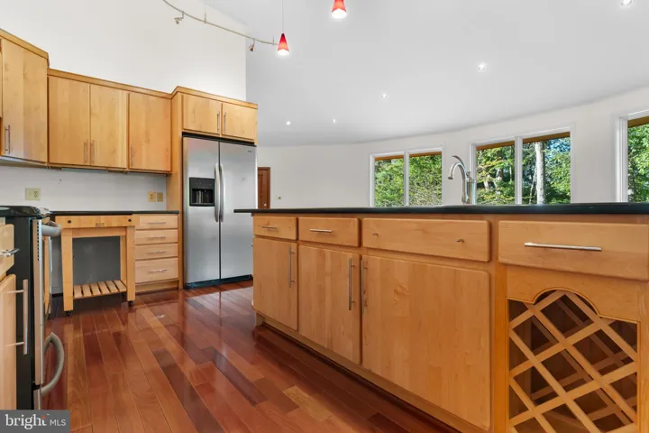 The kitchen has maple cabinets, stainless steel appliances, and ample granite counters. The large island has a separate prep sink, built in wine rack, cabinets with pull-outs, and space for bar stools. Next to the main sink is a clever butcher block on wheels that tucks under the counter when not in use. The built in pantry is a marvel of accessible storage.