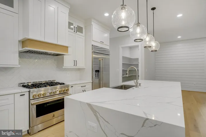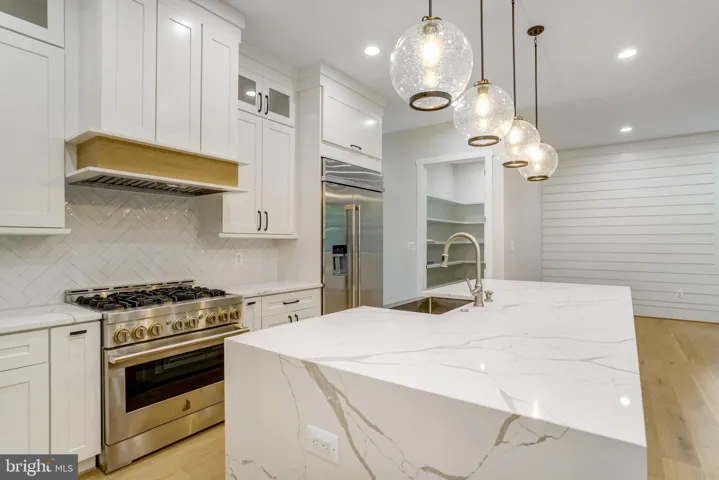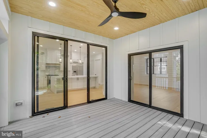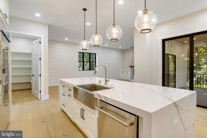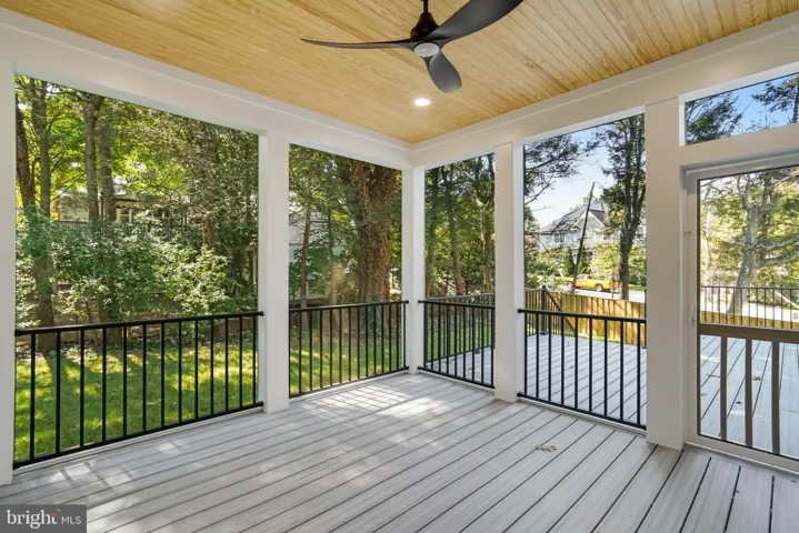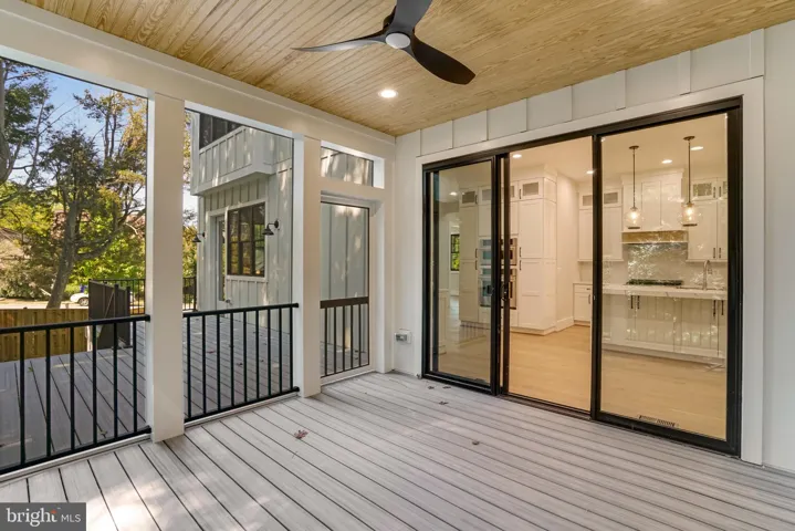 The butler’s pantry leads into the stunning Chef’s kitchen, equipped with high-end JennAir appliances, custom stacked cabinets, under-cabinet lighting, a spacious waterfall island with bar seating, quartz countertops, and a ceramic tile backsplash. The kitchen seamlessly flows into the breakfast area and family room, which features a tray ceiling. A deck and screened porch off the breakfast nook complete this ideal indoor/outdoor entertaining space.