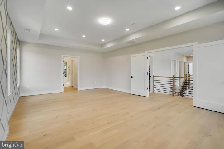 A wide staircase leads to both the upper and lower levels, illuminated by large windows. The upper level hosts the luxurious owner’s suite, complete with dual walk-in closets, tray ceilings, a custom accent wall, and a sitting area. The master bathroom exudes luxury with double vanities, marble finishes, a separate shower with heavy glass-enclosed doors, and a freestanding bathtub. This level also includes two bedrooms with a Jack-and-Jill bathroom, a princess suite with a private full bathroom, and a laundry room.
