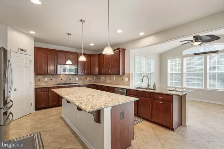 Large gourmet kitchen offers a lot of cabinet space, dual ovens, 5 burner cooktop, a walk in pantry and a huge island for entertaining.