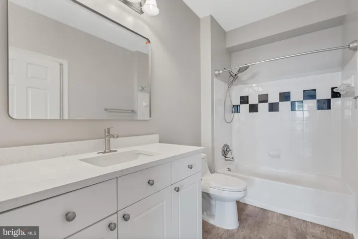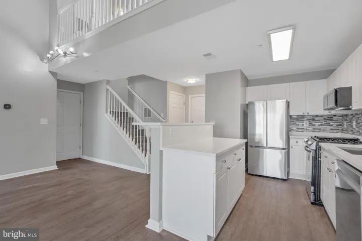 Modern kitchen showcases all-new energy-efficient Samsung stainless steel appliances (refrigerator, gas range with air fryer, built-in microwave, and a whisper quiet dishwasher) that are complemented by new quartz countertops and a tile backsplash, and an upgraded deep sink with a new pullout faucet.