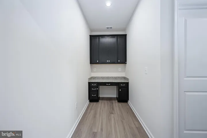 Luxury vinyl plank flooring runs throughout the foyer, kitchen, dining, family room, pantry, laundry, hallway, and primary suite, including the primary closet. A pocket office features 42-inch upper cabinets and granite countertops, while the laundry room includes a three-piece rough-in for a sink.