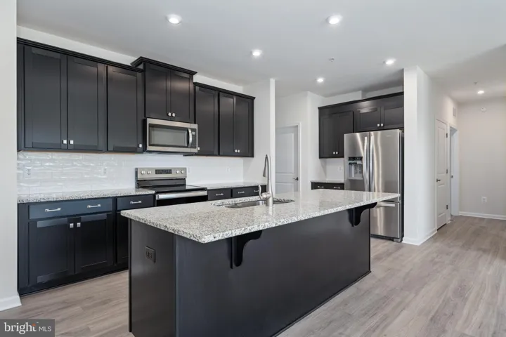 The family room, with high ceilings and large windows, connects to a spacious balcony—ideal for gardening. An oversized walk-in pantry offers ample storage, and additional kitchen space can serve as a coffee bar or butler pantry. Stylish features include a ceramic tile backsplash, pull-out shelves, and 42-inch upper cabinets with upgraded finishes. The kitchen is equipped with a pull-down spray faucet and stainless steel undermount sink for both functionality and elegance.