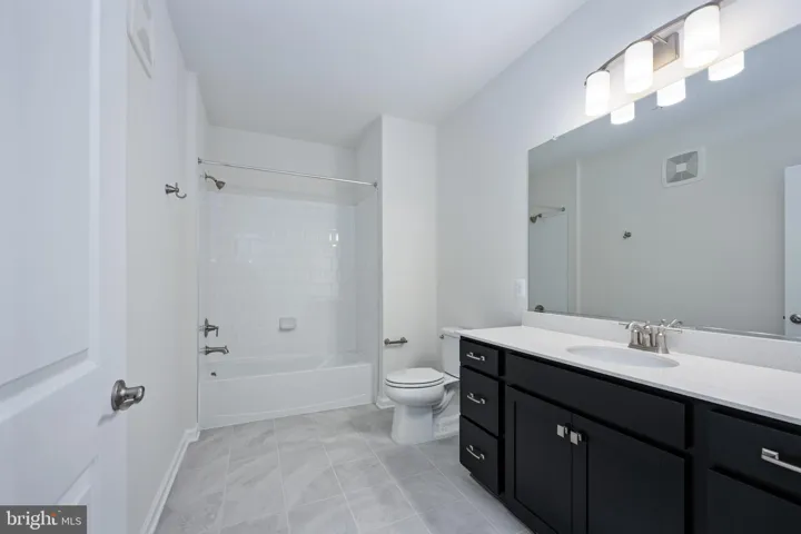 The shared bath has ceramic tile flooring, a tub/shower combo, and an upgraded vanity with quartz counters. Two additional secondary bedrooms offer generous walk-in closets, suitable for guests or home offices.