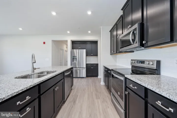 Luxury vinyl plank flooring extends through the foyer, kitchen, dining, family room, pantry, laundry, hallway, and primary suite. A pocket office space with 42-inch upper cabinets and granite countertops is adjacent to a large laundry room with a three-piece rough-in for a sink.
