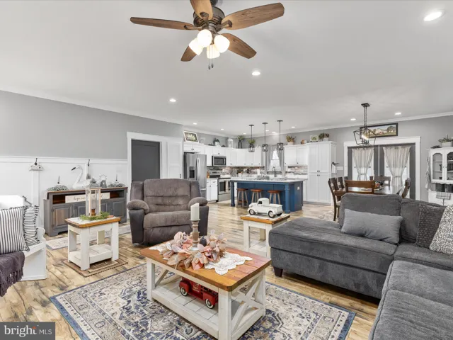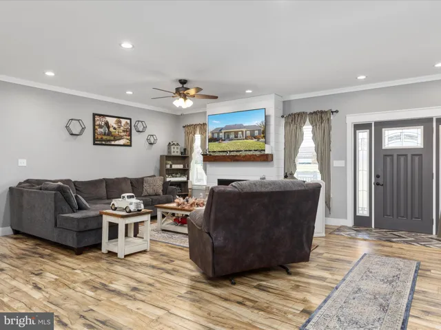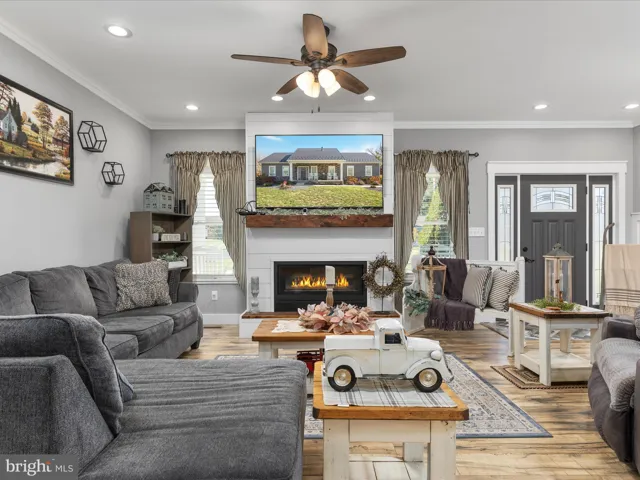 Step inside to discover an open-concept living space adorned with upgraded LVP flooring, custom crown molding, and elegant wainscoting throughout. The spacious living room features a cozy fireplace, perfect for relaxing evenings or family game night.