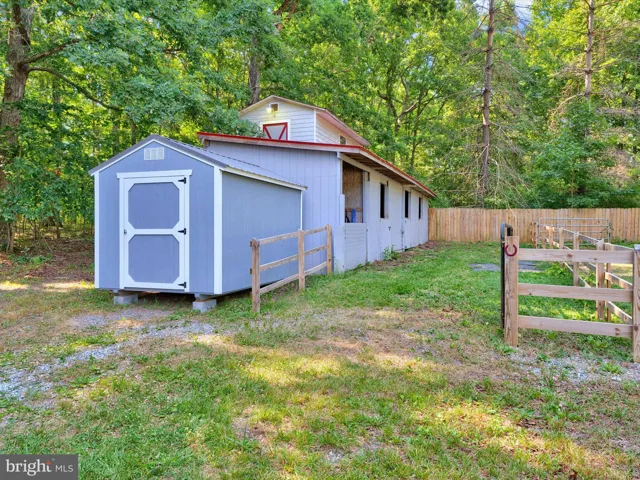 The layout of the property was well thought out, with the 3 stall barn tucked neatly to the side and the pasture space maximized. It has 4 fenced paddocks with gates between to use however you like! The stalls are all a solid 12×12, with an additional open storage area perfect for hay, or use as a grooming stall. There is a portable shed in place used as the tack room that will convey. Behind the barn is a large hay storage area or use for tractor/mower parking. The stairs on the side of the barn lead you to the large loft which has begun to be finished out as a workshop or possible studio.