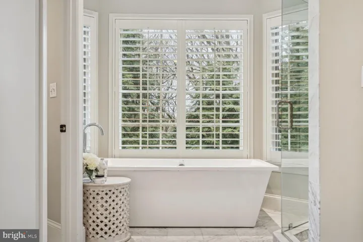 The main floor includes a formal living room with bay window, built-in shelving, recessed lighting, and custom window treatments. The formal dining room is equally impressive, with custom shutters and a Butler’s pantry that connects to the spacious open kitchen. Here, you’ll find an oversized marble-topped island, granite countertops, tile backsplash, stainless steel appliances, and even two paneled dishwashers. French doors lead to the backyard, perfect for entertaining or simply relaxing in the private, tree-lined yard.