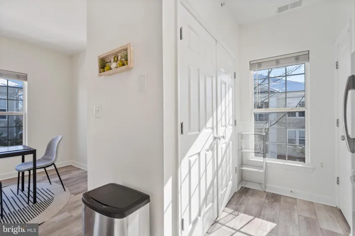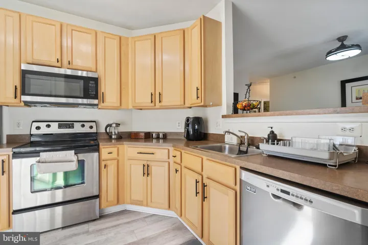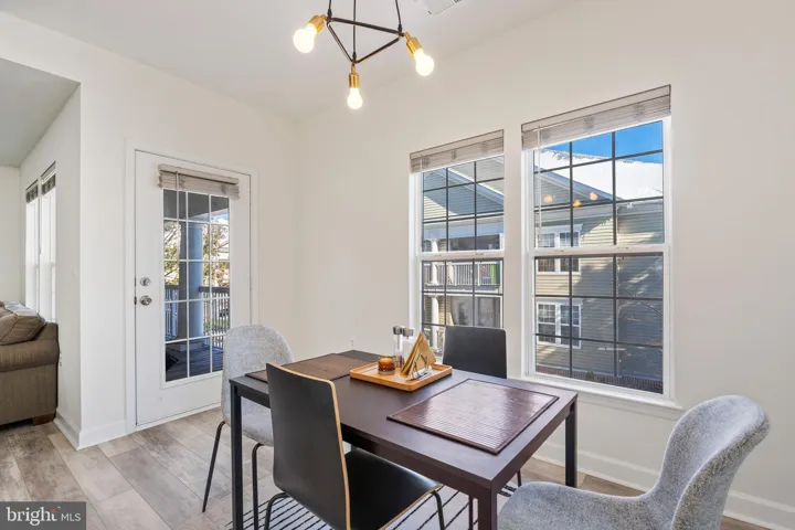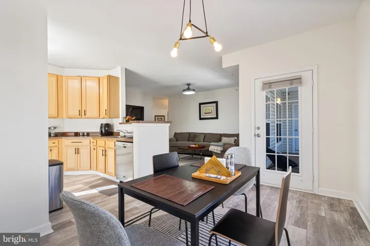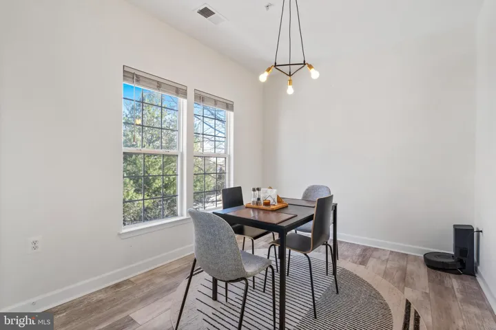 The modern kitchen boasts sleek stainless steel appliances, brand-new laminate floors, stunning hardwood cabinets, and ample counter space, complete with a wraparound breakfast bar. Adjacent to the kitchen, the dining area is ideal for enjoying meals with family or friends.