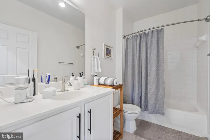 The primary bedroom is bright and airy, featuring excellent natural light and an en-suite bathroom with elegant tilework, contemporary fixtures, and a large vanity. The generously sized second bedroom overlooks the porch, providing a peaceful retreat.