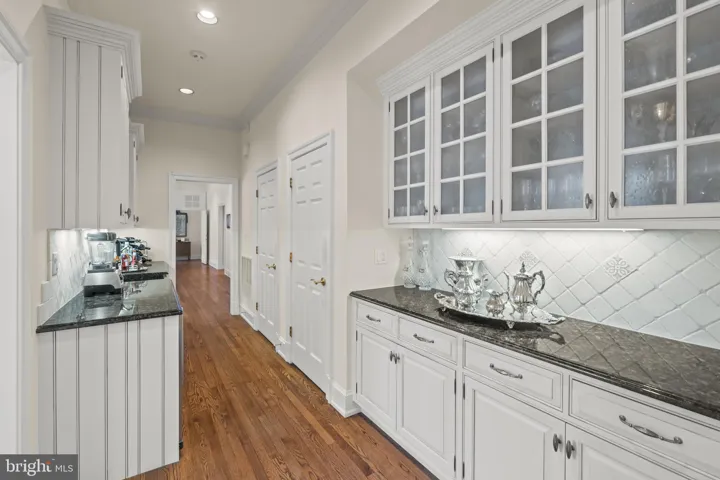 A beautifully appointed butler’s pantry enhances the entertaining experience, featuring custom cabinetry, pantry closet space, Fisher & Paykel dishwasher drawers, a wine fridge, and a beverage fridge.