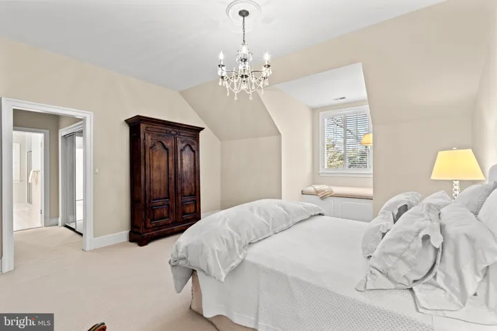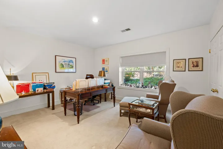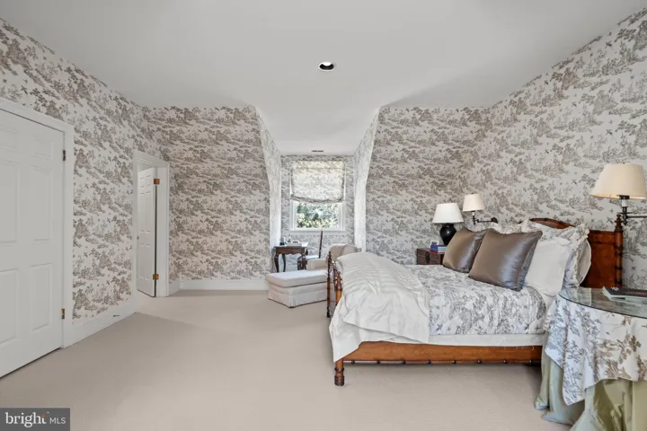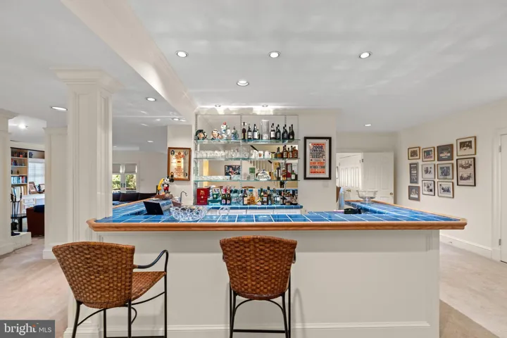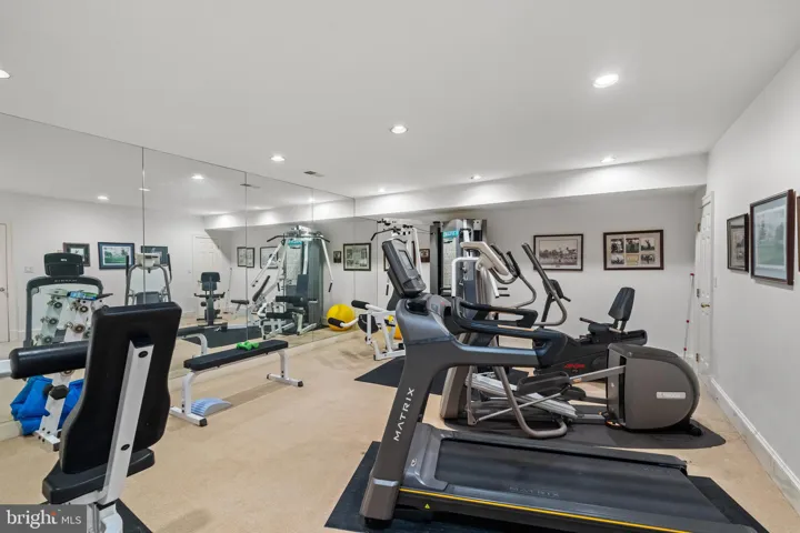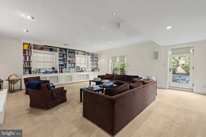 The lower level is a haven for entertainment and leisure, featuring a fully equipped bar, a billiards room, a recreation room with a projector and pull-down screen, a gym, an office/bedroom with adjoining full bath, and a playroom or nanny room with ensuite full bath. A wood-burning fireplace in the lower-level recreation room adds warmth and ambiance, seamlessly extending the living space while maintaining a sense of coziness and privacy.