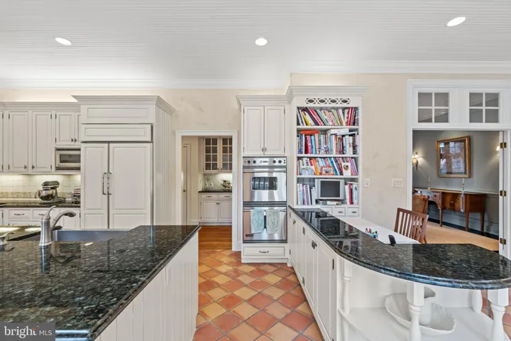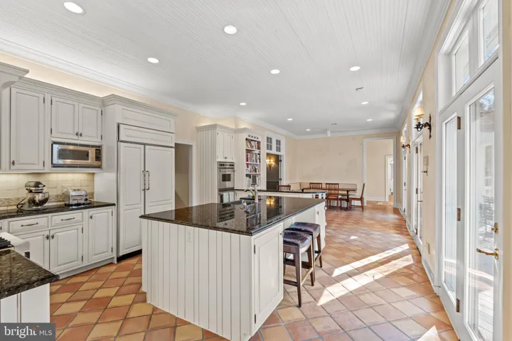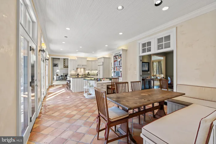 The kitchen itself is of exceptional quality, boasting Viking double ovens, a Viking range cooktop, a Sub-Zero refrigerator, a prep sink, a Miele dishwasher, a stainless-steel farmhouse sink, and timeless Mexican tile flooring. Venetian plaster walls add an artistic touch to this culinary haven, complemented by a built-in banquette and a planning desk for added convenience.