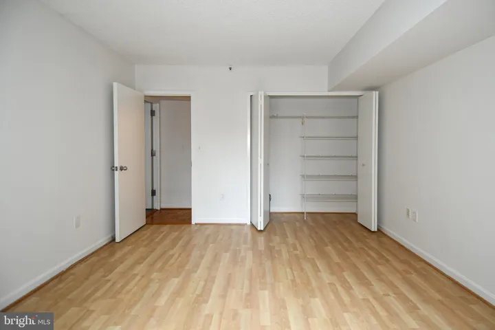 The adjacent second bedroom has laminate floors and more closet space. It is served by an additional, tiled bathroom with tub/shower combination.