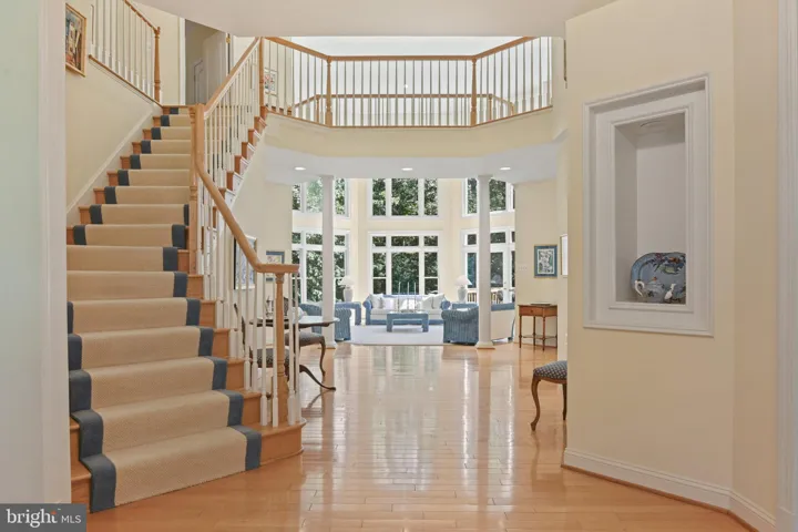 The thoughtful floor plan showcases 9-foot ceilings and 8,815 total square feet of living space offering hardwood flooring on main and upper levels. A welcoming two-story foyer opens to formal living and dining rooms, a sun room with tranquil views, and a two-story family room filled with natural light. The main level also features a private office/library, spacious kitchen with Corian counters and abundant cabinetry, a butler’s pantry, powder room, laundry/mudroom, and upgraded lighting throughout.