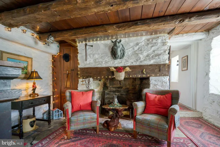 The first floor welcomes you with a twin set of entryway doors that open into the original tavern spaces which feature a beamed ceiling, stunning stone floors and stone walls and a cozy fireplace surrounded by wood cabinetry.