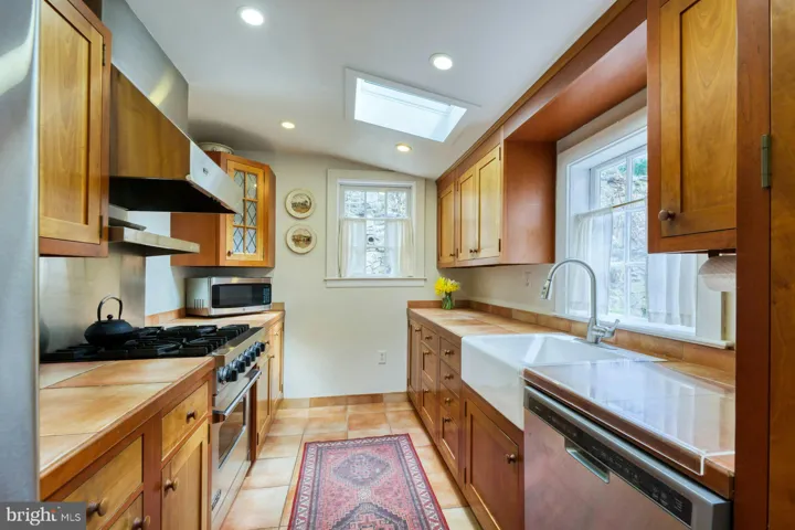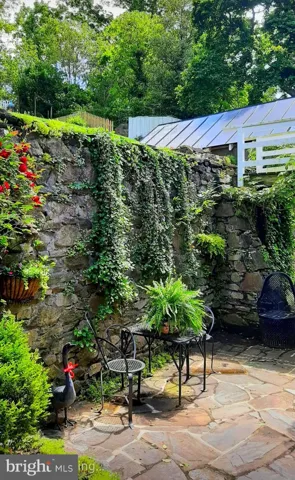 The custom kitchen is outfitted with cherry cabinets and modern amenities. This level extends to a lovely sunken-walled stone patio, perfect for al fresco entertaining. Above the patio walls lies the three-terrace yard featuring newly dry-stacked stone walls, boxwoods, an Asian Cherry Tree, a hidden Amish style garden shed, and cutting gardens with spring daffodils, lilies, poppies, irises, peonies, and more.