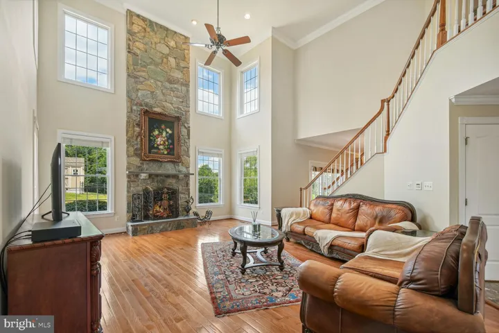 Step inside the grand foyer, where dual curved staircases open to a sun-drenched two-story family room, anchored by a striking floor-to-ceiling stone wood-burning fireplace. The expansive eat-in kitchen features granite countertops, a large center island, and stainless steel appliances, flowing seamlessly into a formal dining room—ideal for gatherings and special occasions.