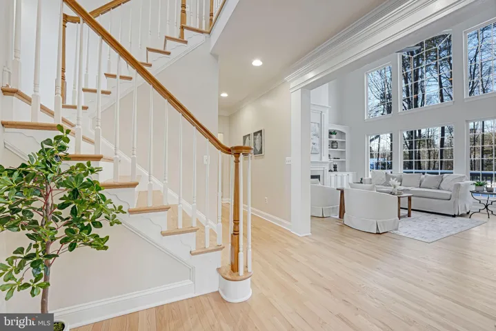 A welcoming two-story foyer with solid oak hardwood floors leads to the spectacular Family Room with soaring ceilings, gas fireplace anchored by built-in media cabinets, and floor to ceiling windows, affording incredible views of nature and the scenic golf course Fairway.