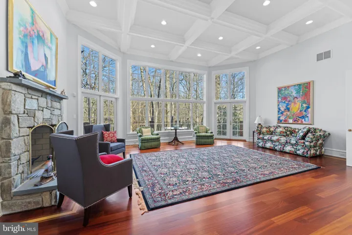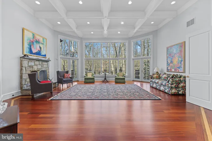 Octagonal Great Room featuring 14-ft window walls, coffered ceiling, stone fireplace, and wrap-around Ipe deck