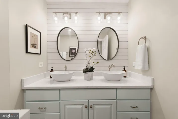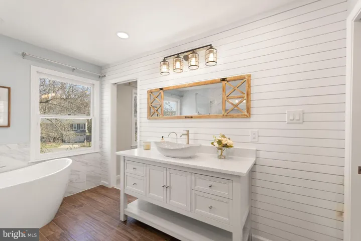Upstairs, the primary suite was expanded in 2020 to include a spa-like ensuite and a boutique-style walk-in closet. After a long day, unwind in the luxurious freestanding soaking tub, beautifully framed by elegant marble tile, or enjoy the massive glass-enclosed walk-in shower with marble accents. The suite features two separate ensuite bathrooms, each offering privacy and convenience—one with a sleek quartz countertop and shiplap accents, and the other with its own walk-in shower, generous vanity, and stylish finishes. A spacious walk-in closet with custom shelving completes the retreat.