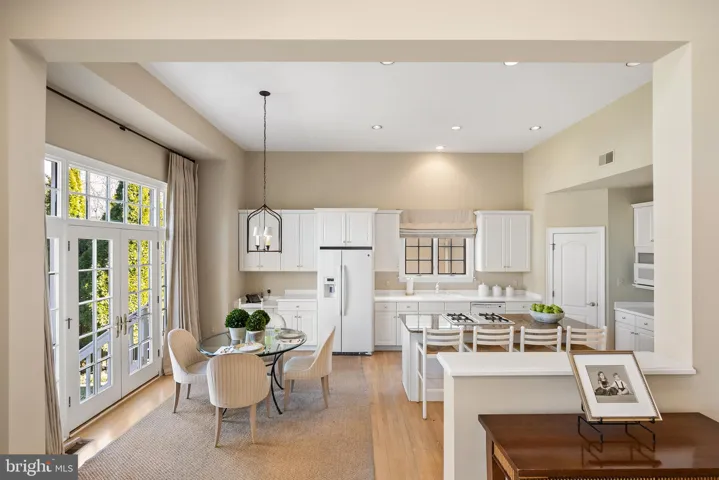 The open kitchen has a sunlit breakfast area and a generous countertop with seating.