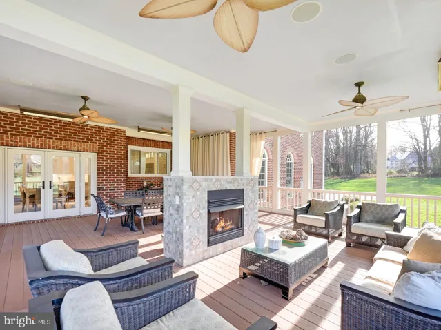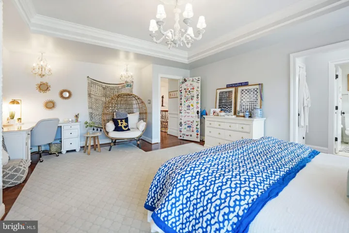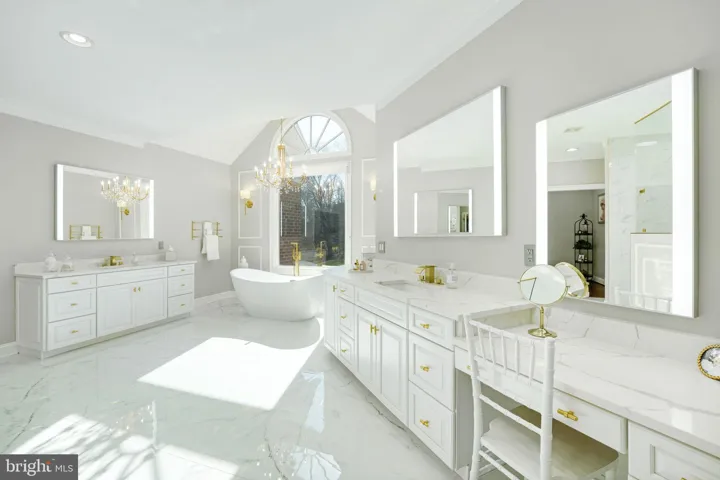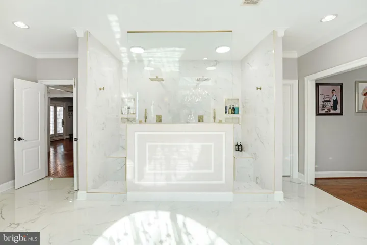 Escape to the primary suite, a sanctuary of elegance featuring a private fireplace, a spacious sitting area, and a walk-in closet that dreams are made of. Step out onto the expansive elevated deck and take in the breathtaking views of your estate. The lavish spa-like en suite bathroom is a masterpiece with white marble floors, a freestanding tub, and a luxurious dual shower.