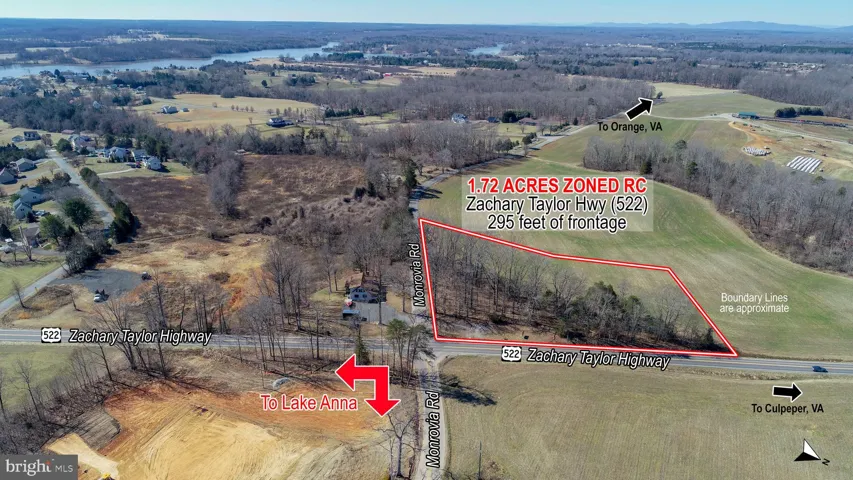 NEW PRICE! Here is your opportunity to purchase HIGHLY DESIRED COMMERCIAL PROPERTY minutes to Lake Anna on the Public Side at a fabulous price!!! What a great location at the intersection of Rt. 522 (Zachary Taylor Highway) and Rt. 612 Monrovia Road), with two convenient entrances on both roads, catacorner to the new Dollar General being constructed now and close to Tim’s and The Cove Restaurants. This sale consists of 2 Tax Parcels: 53-1-4 (.63 acres) and 53-A-2A (1.09 acres), a total of 1.72 Acres, Zoned RC – Resort Commercial with a variety of permitted uses. The Lake Anna area is growing fast, and this is your chance to be among the many new businesses enhancing the Lake experience!