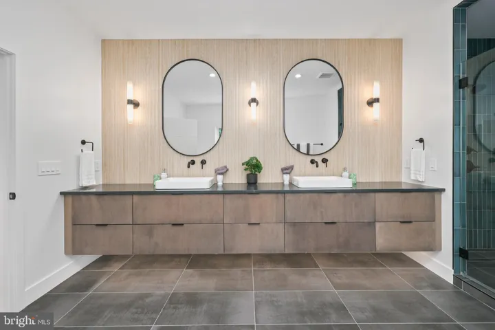 On the second level, you’ll find a large laundry room with a wash sink, a guest bedroom with an ensuite bathroom, two additional bedrooms sharing a Jack and Jill bathroom, and a luxurious primary suite. The suite includes a custom accent wall with lighting, a walk-in closet, and a spa-like bathroom with a skylit oversized shower, dual vanities, and a freestanding tub.