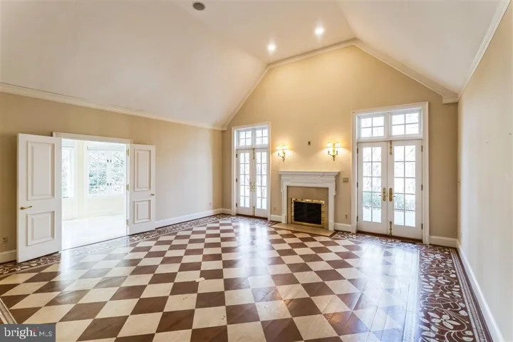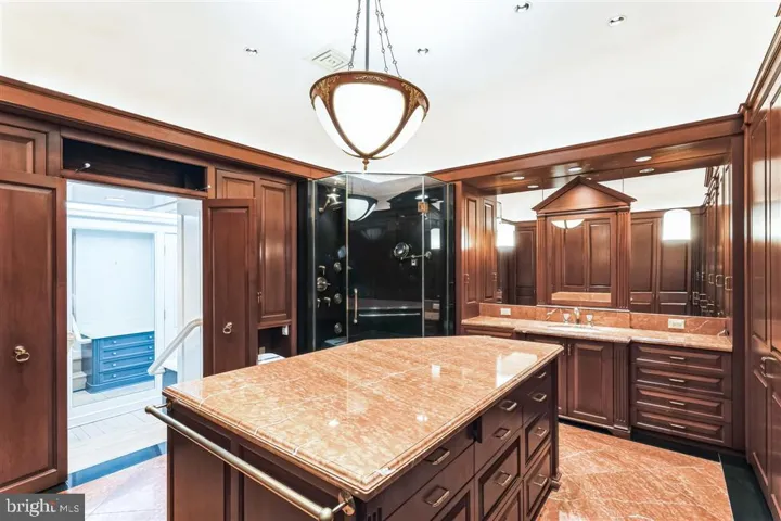 The other entry is a carriage entryway and adjoins the club room with decorative wood paneling and custom built ins. Adjacent to the club room is the family room with dual chandeliers, a stone fireplace and decorative wood and vaulted ceilings. The bathrooms, appointed with unparalleled highest level finishes, include cherry cabinetry, onyx stone, marble tile, a jetted tub, steam shower and other luxury fixtures.