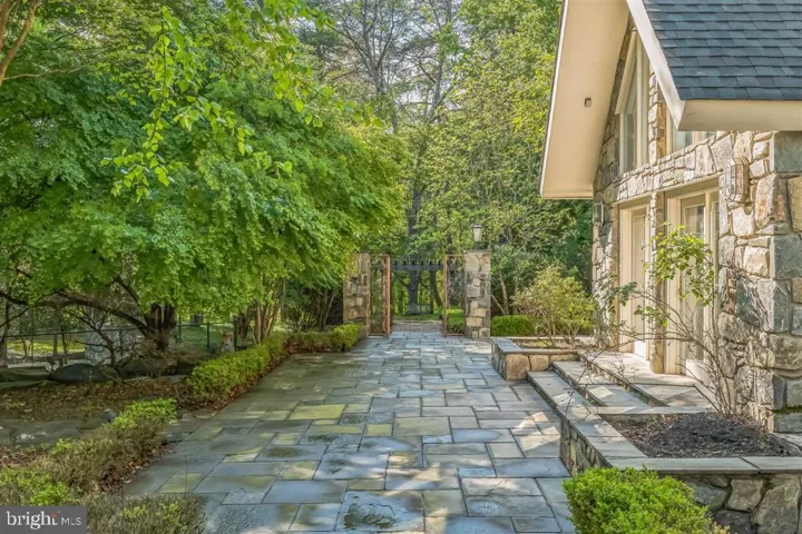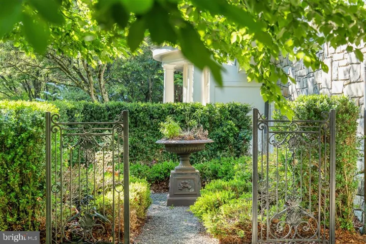 The primary suites includes 2 full bathrooms, a sunroom and an adjoining library featuring vaulted wood ceilings, leaded glass, and custom built in shelving. Hardscapes and outdoor entertaining spaces include flagstone patio, pea gravel pathways, stone fountains, imported iron gates and a beautiful tennis court with majestic views of the estate.