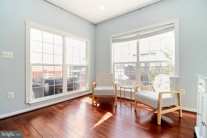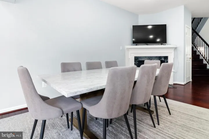 The gourmet kitchen is a chef’s dream, featuring gleaming granite countertops, an abundance of custom 42” cabinetry, and stainless steel appliances, including double wall ovens and a newer refrigerator. A center island with a brand-new cooktop provides additional workspace and bar seating, while designer tile backsplashes and flooring complete the stylish aesthetic. French doors open to a spacious deck overlooking the rear yard and open common area—ideal for morning coffee or evening relaxation.