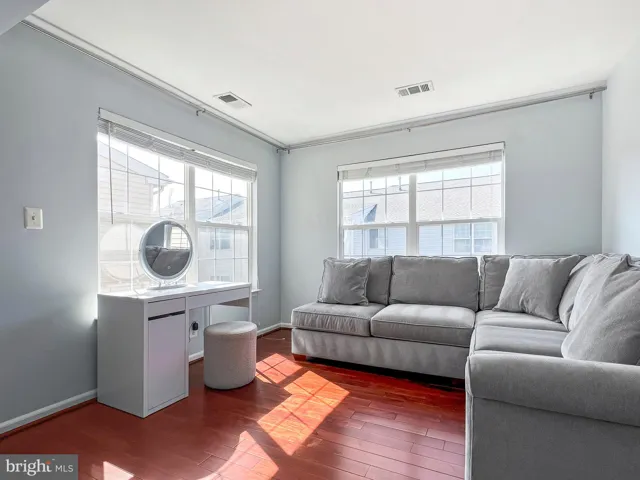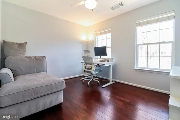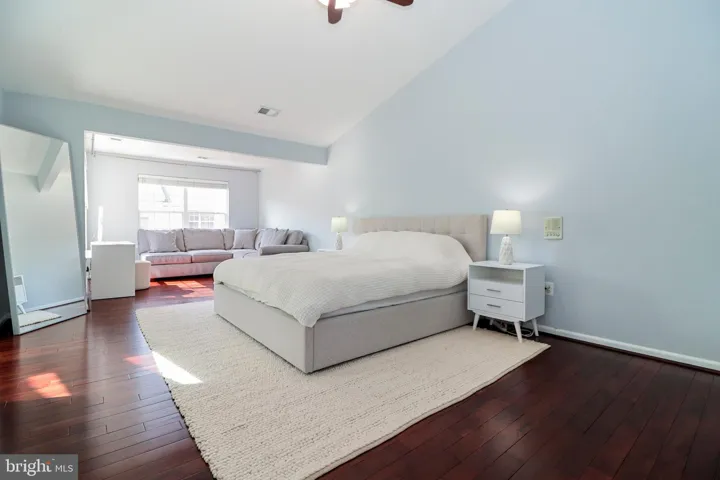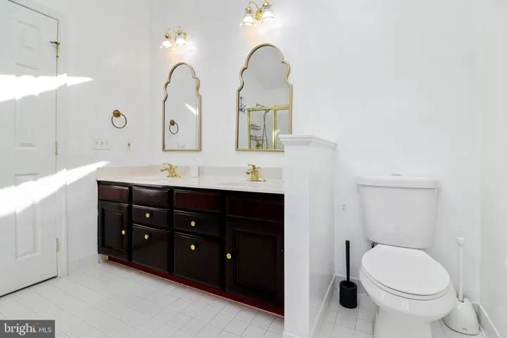 Upstairs, the stunning owner’s suite is a true retreat, boasting a soaring vaulted ceiling with a lighted ceiling fan, a spacious walk-in closet, and a private sitting area. The spa-like en suite bath with a dual-sink vanity, chic mirrors and lighting, a luxurious corner soaking tub, and a glass-enclosed shower – all enhanced by a vaulted ceiling and skylights for an airy, light-filled atmosphere. Down the hall, two additional sunlit bedrooms with hardwood flooring share a remodeled hall bath, complete with a dual-sink granite vanity and a frameless glass-enclosed shower with marble-style tile.