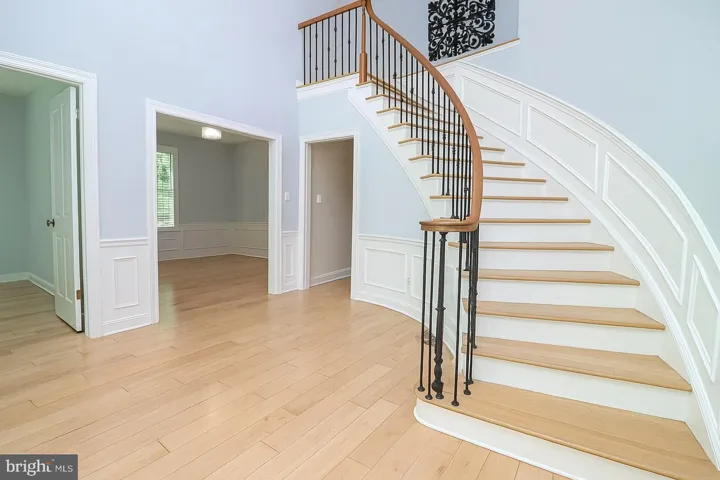Step into the grand two-story foyer, highlighted by an elegant curved staircase and classic center-hall layout. A formal dining room sits to the right, perfect for hosting, while a spacious main-level office to the left is enclosed with stylish double glass-paned doors for privacy.