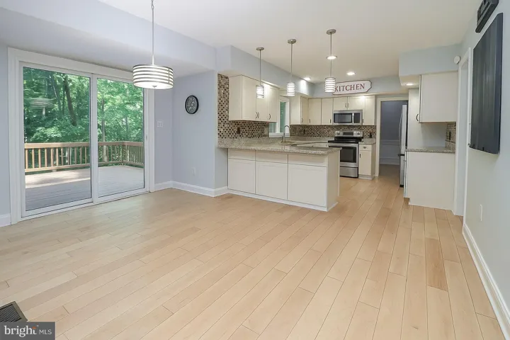 Freshly refinished hardwood floors span the main and upper levels, bringing a light and airy feel throughout. The updated kitchen features refaced cabinetry and connects effortlessly to the eat-in breakfast area, butler’s pantry, and expansive family room with a gas fireplace. A sliding glass door leads to a huge Trex deck—ideal for indoor-outdoor entertaining.
