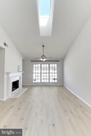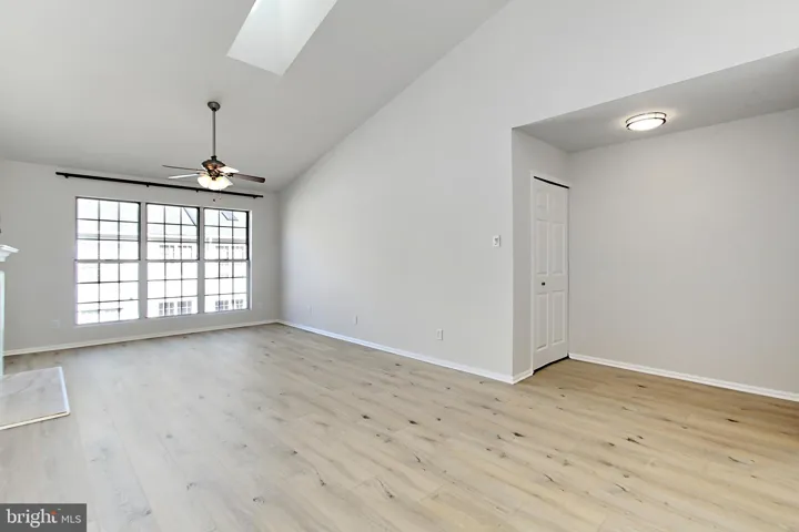 Step into a bright and inviting foyer that opens to a spacious living room filled with natural light. Vaulted ceilings and a skylight create an airy, open feel, while a cozy wood-burning fireplace adds warmth and charm to the space. The main living areas are beautifully finished with wood laminate floors, offering both style and durability.