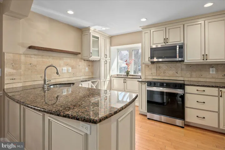 The spacious and open kitchen is a chef’s delight, boasting granite countertops, stainless steel appliances, and a brand-new stove, all surrounded by ample custom cabinetry. Just off the kitchen, the inviting family room offers a cozy wood-burning fireplace and seamless access to the private, fenced-in patio—ideal for entertaining or relaxing outdoors.